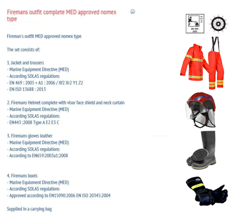 根据SOLAS的规定,要求船上配备符合IMO消防安全系统FSS规则中规定标准的消防防护服。《SOLAS》第II-2章第10