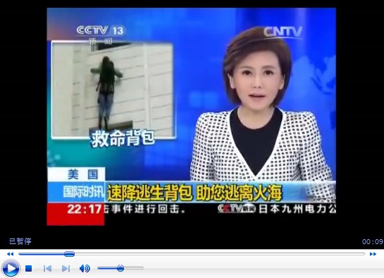 热烈祝贺中央电视台新闻频道对我司新产品Skysaver高楼逃生背包进行了全面报道