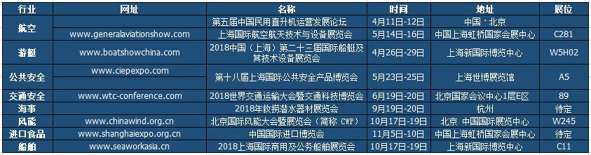 | 船舶 | www.seaworkasia.cn | 2018上海国际商用及公务船舶展览会 | 10月17日-19日 | 上海新国际博览中心 | C11 |