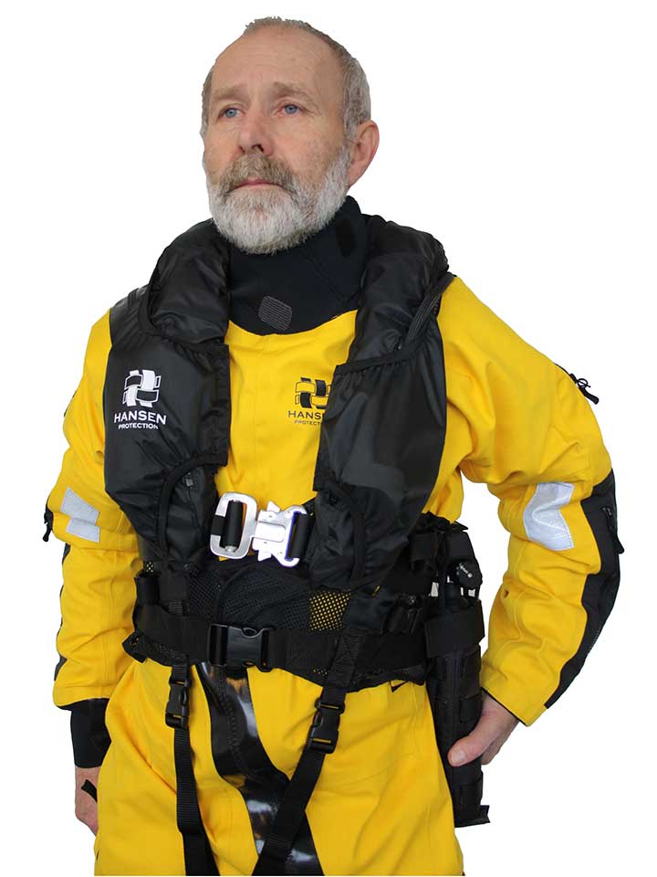 本次展会领海集团带来的来自挪威具有140年历史的HANSEN飞行员工作服Seawind.它是一款适用于直升机飞行员、水上救援、风电平台等作业的工作服,它具有舒适和方便的设计,由具有高度透气特性的耐用纤维GoreTex材料制成,颈部具有防水拉链设计更舒适,腋下设计有透气拉链,高可见度的荧光色搭配,宽大的网状纤维口袋,带不锈钢材质D型环和弹簧钩的起吊带,头罩手套都配备有相应位置的口袋,带漂浮钩的安全绳,可与经过认可的救生衣一起使用;SeaWind工作服满足ISO15027关于 B级套装(4小时热保护)的要求和ETSO法规(需与内衬一起穿戴)。这款来自挪威Hansen公司的工作服,凭借其精湛的细节处理、极大的灵活性和宽广的应用范围等特点,获得了众多行业巨头和专业人员的认可,而不局限于风电运维行业,经过CAA-UK认证,同时SeaWind工作服也获得SOLAS、ISO和EASA的认证。因此,它已经被批准在大部分要求苛刻的工作情况下使用。没有其他救生服能声称像SeaWind一样适用于如此宽广的应用范围。为了能够首家提供批准用于工作、海运和直升机运输的救生服,Hansen公司已经坚持不懈地进行了长期努力。为了获得直升机运输服认可,公司必须为工作服配备衬里并且它必须能够与SeaLion救生衣一起穿戴。此外,工作服配备有漂浮绳钩,这是Hansen公司特有的。应急呼吸系统,SeaLion救生衣中集SeaAir EBS应急呼吸系统于一体,该系统使得在水下开始呼吸成为可能,这是以前的应急呼吸系统不能实现的。