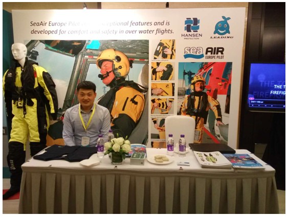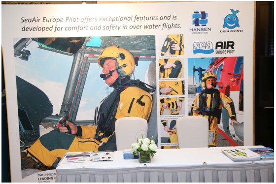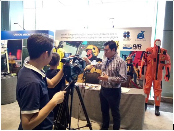 在此次直升机论坛上,领海集团的一位客户专门前来感谢,原因是去年冬天他们的一位飞行员失事后6个小时被成功救起,他正穿了我们的SEAWIND飞行员服。领海集团CEO王建军表示,这是我今年听到的最好的消息。在0-10摄氏度的水温里,如果没有特殊保护衣服,人只能存活3-5分钟。参会期间,领海集团CEO王建军和中国航空运输协会通用航空分会常务副会长原中信海直总经理刘铁雄沟通了压缩饼干在救灾时候的应用,刘会长回忆了多年前救灾时候使用直升机运送食品的不易,我们的GC-Rieber挪威压缩饼干广泛应用在联合国救灾领域,是联合国合格供应商,GC-Rieber压缩饼干具有体积小,能量大,耗水小的特点,在救灾时候可以节省很多运力,刘会长表示赞赏。同时王总还接受了通航博览媒体的采访,王总重点介绍了降温背心,E.COOLINE ®是一个基于创新功能性纺织品的3D系统,可以稳定并检查体温以至保存身体能量和健康。该系统即使在高温下进行长达20小时的工作也能有效发挥功能。