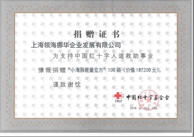 上海领海挪华企业发展有限公司作为中国最大的救生设备公司,在“保护人命、财产和环境”企业宗旨引领下,携手中国红十字基金会,为弘扬“人道、博爱、奉献”的红十字精神,积极承担社会责任,支持中国红十字会开展的红十字天使计划,关注和帮助救援队员人群。上海领海挪华企业发展有限公司捐赠“小海豚能量立方”(营养代餐品)100箱,用以支持开展救援队员在灾区紧急食品供给等相关公益活动。