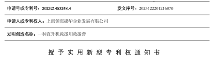 领海直升机救援用救援套,具有快速连接、安全可靠、避免二次伤害等特点,可安全、快速、高效实施直升机救援中人员救助作业。目前已获得国家专利授权。