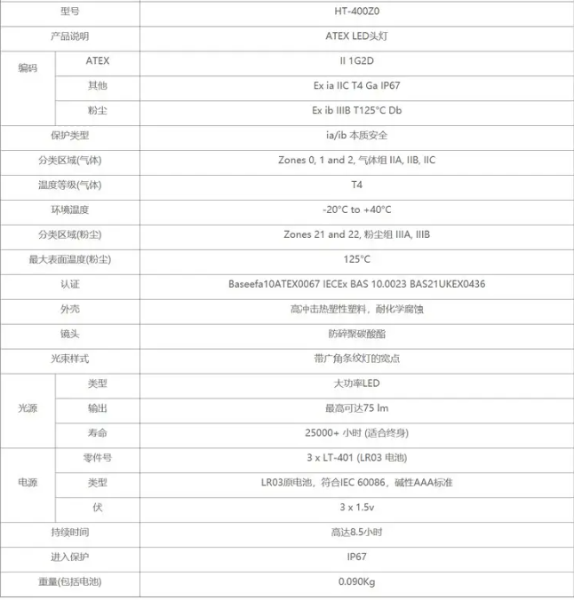 ATEX和IECEx防爆认证头灯HT-400Z0