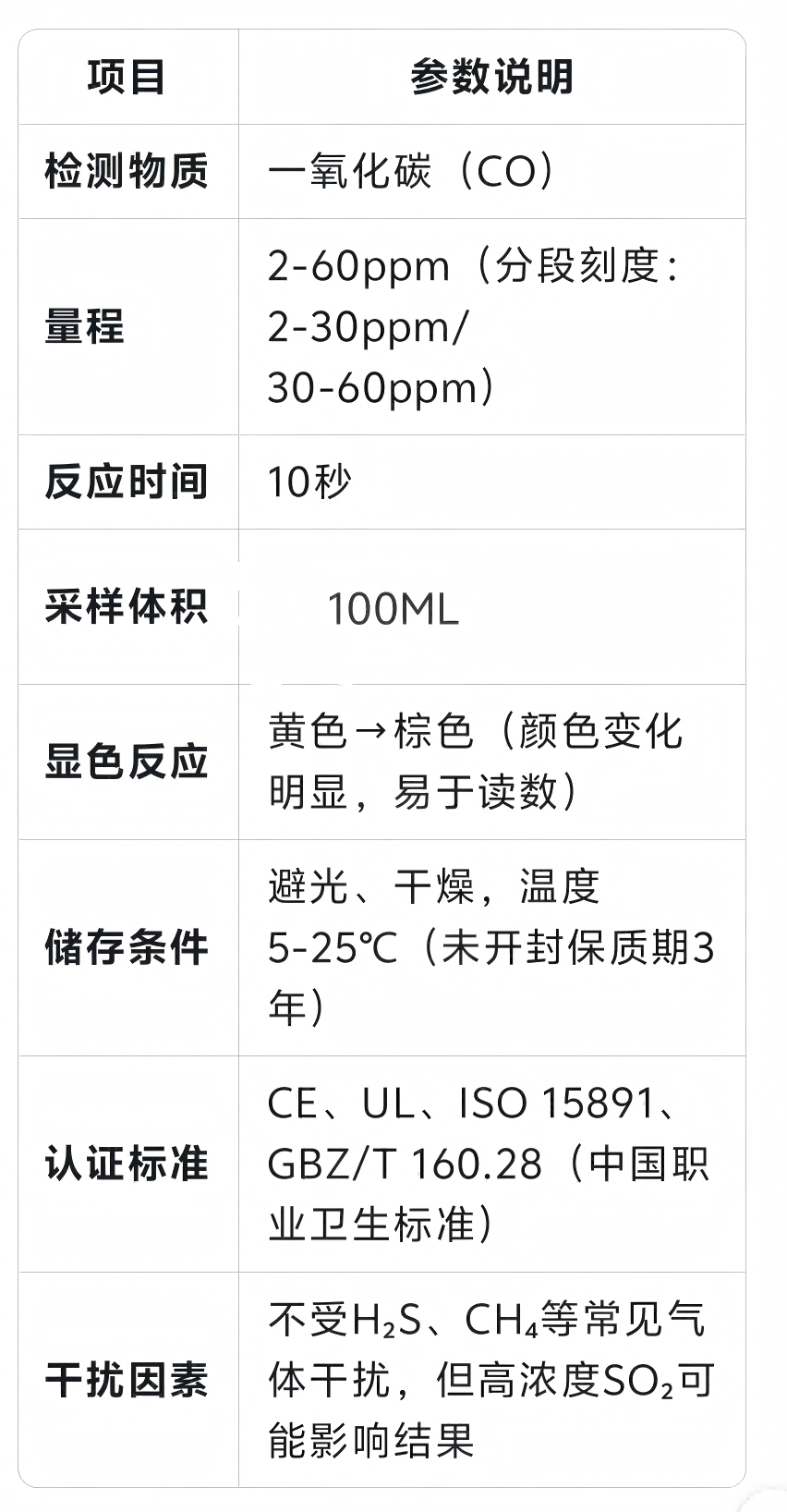 - 检测前确保环境通风,避免高浓度CO直接吸入。